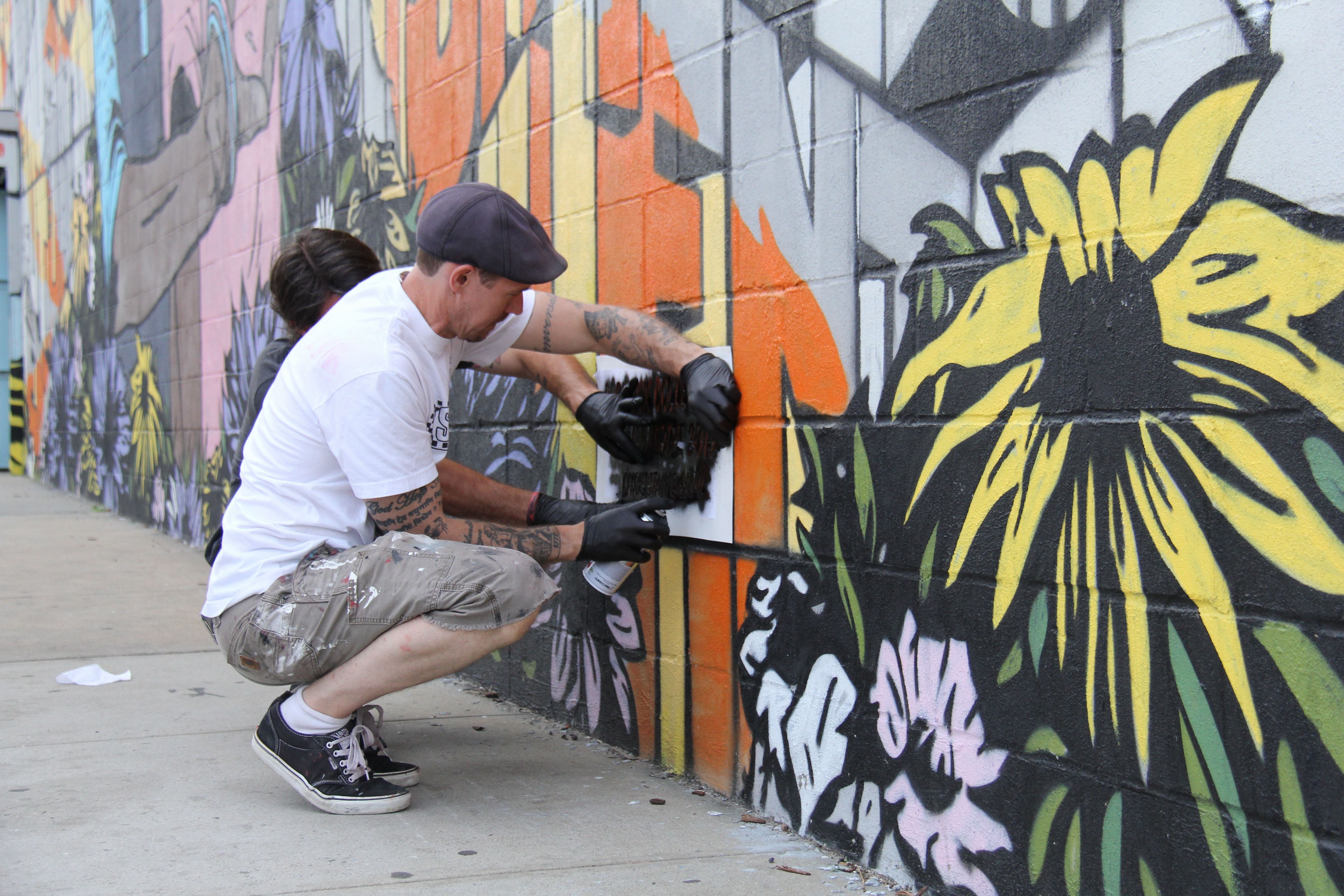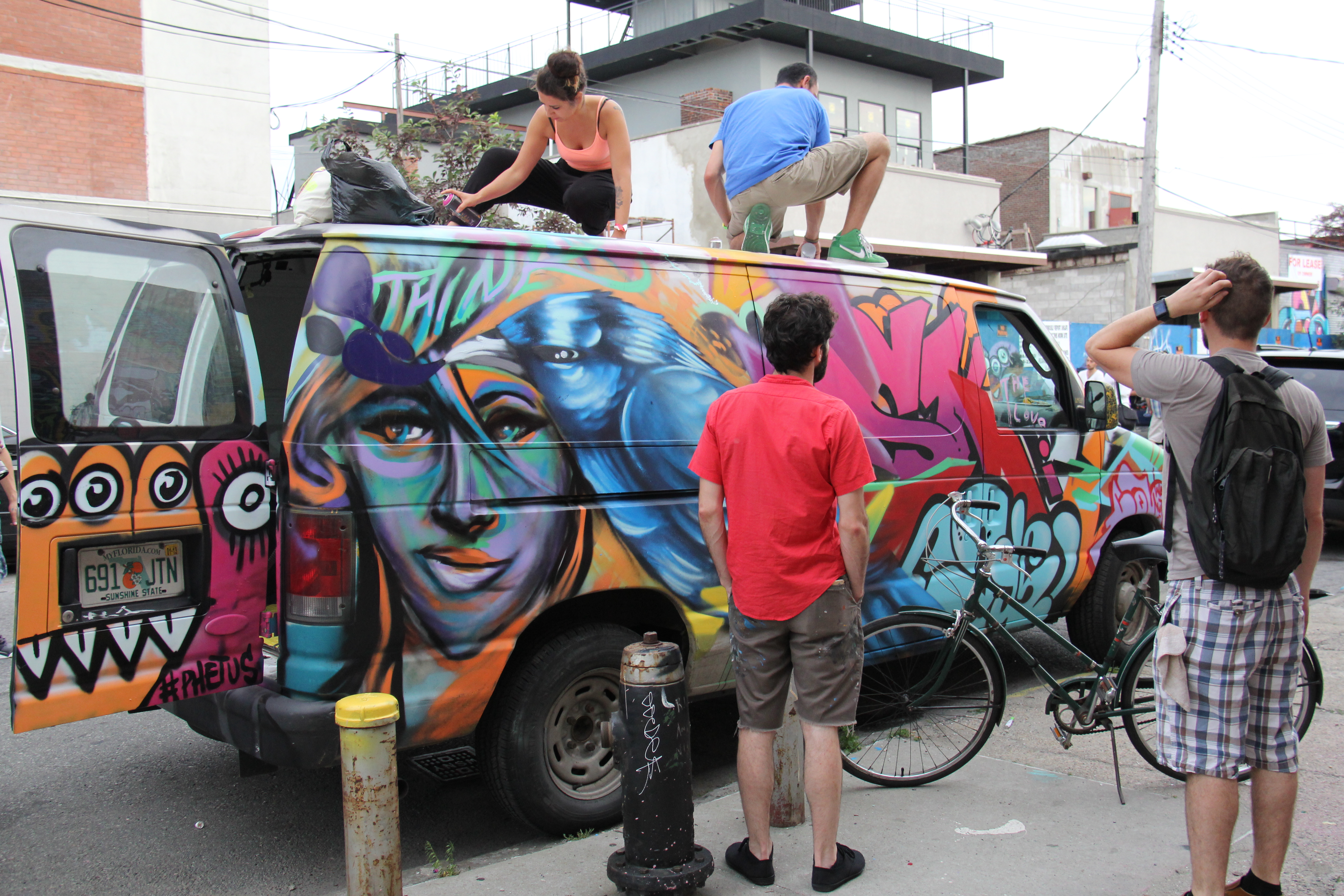 Street art, or Graffiti. Bushwick is a capital of graffiti, a friendly home for wall artists 🙂 You can see lots of wall paintings walking from block to block in Bushwick. The graffity art can be mobile, too. We saw a team of artists, energetically painting their van!