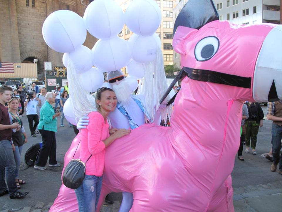 This colorful procession was marching through the streets of DUMBO during two hours cheering people and shouting “Don’t give up!” The leader of this unprecedented art procession is Andrey Bartenev, international artist, sculptor, experimentalist renowned for his provocative, interactive installations and performances and bizarre and unexpected costumes. But should you talk to him you quickly realize that he is not just a genius clown but a philosopher, whose main theory-turned-to-be-a-practice is LIVE HAPPINESS.