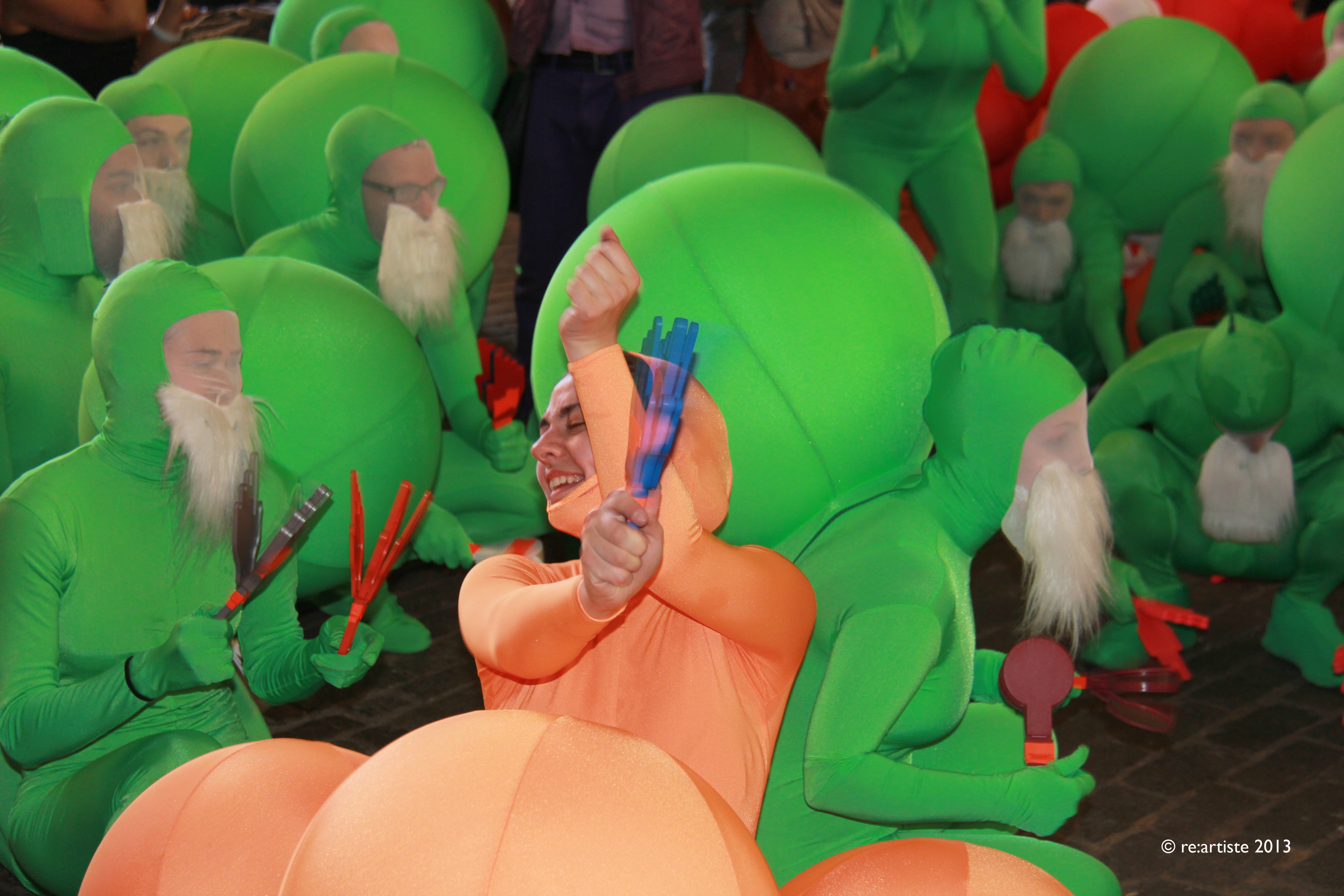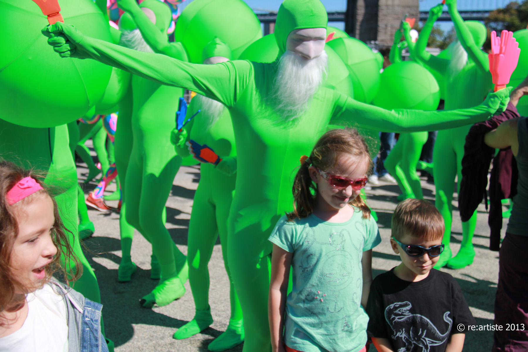 September 28, 2013 – Pier 1 under the Brooklyn Bridge is full of wonderful orange creatures dancing and greeting the public – this is the second day of DUMBO Arts Festival.