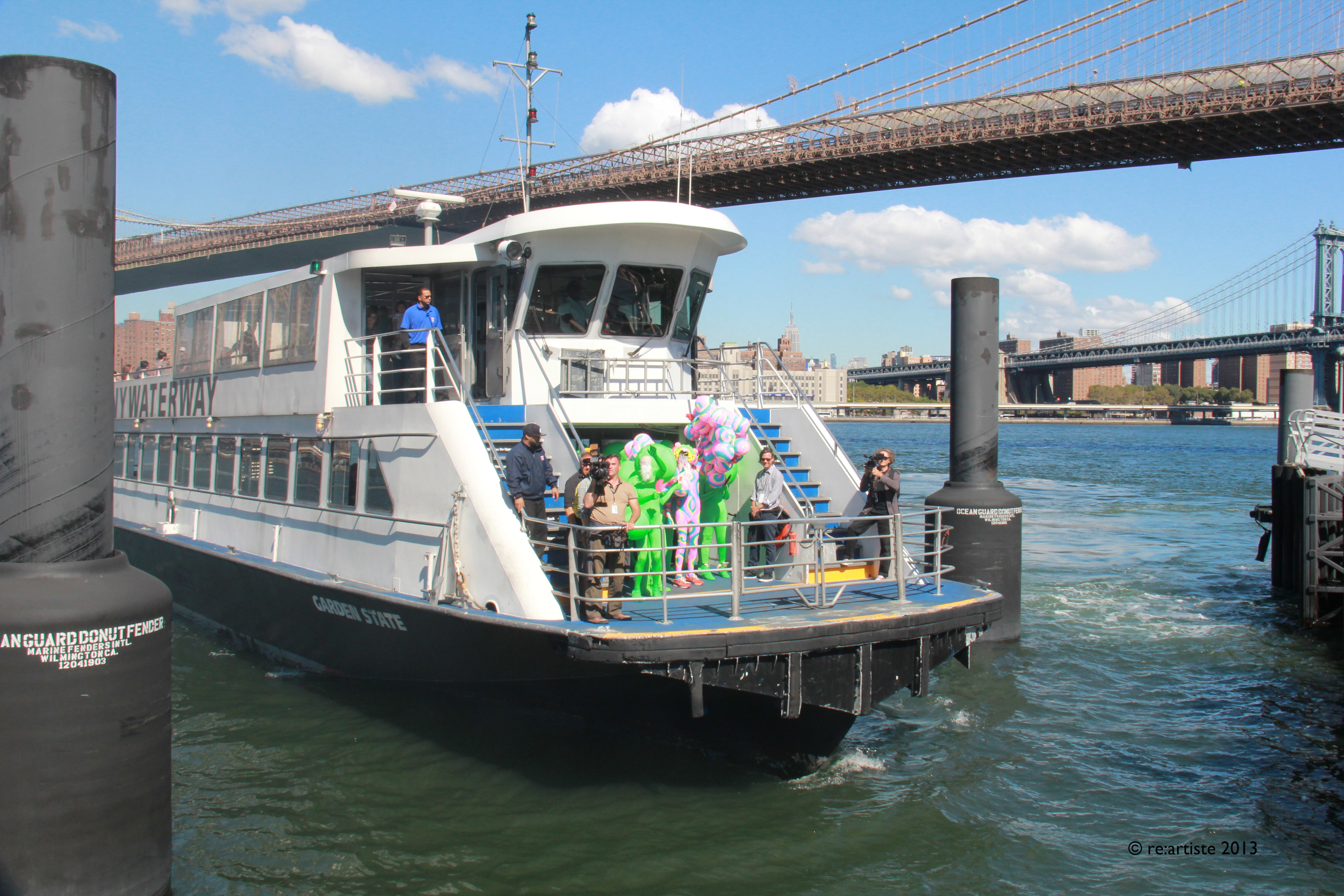But who expected to see the moving, mysterious creatures among the traditional artworks and performance scenes?! People are staring, stunned. And here we go – even a bigger surprise – an old good East River ferry docking, full of boisterous green bodies triumphantly arriving in Brooklyn by the river!